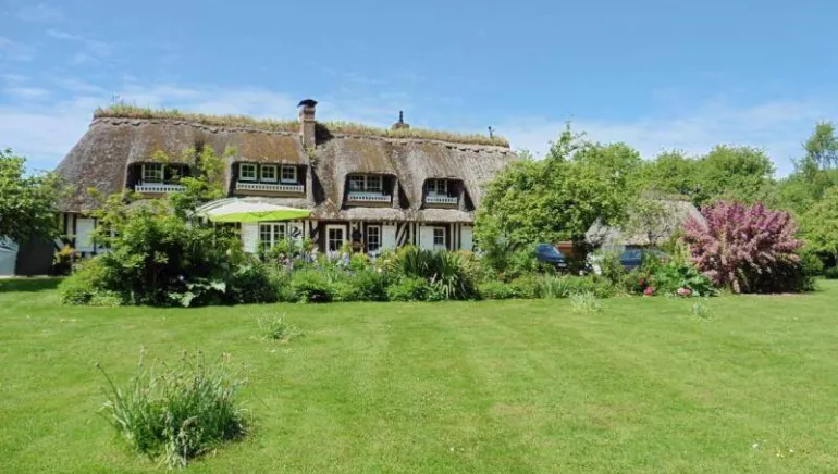 "Le Pré d'Haucourt" is composed of 2 authentic restored thatched cottages, with 5 bedrooms, 3 shower rooms, 1 bathroom, 4 WC. Located in a small village in the heart of the Pays d'Auge, it is a real haven of peace thanks to its vast enclosed and landscaped garden, and its preserved environment. Its proximity to Deauville and the Côte Fleurie opens the possibility of numerous sports, gastronomic, cultural and historical activities. The gite offers space and independence, ideal for a comfortable stay with family or friends with facilities such as: piano, large screen TV, free WIFI (fiber optic), board games, DVD library, outdoor games, etc. Pets are welcome. Horses & riders welcome (150 m from the gite, enclosed meadow and paddock, box. Lodging and food package 20€/day/horse. Possibility of lessons with instructor). Possibility to rent bicycles in Villers-sur-Mer with direct delivery to the gîte